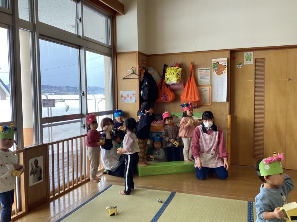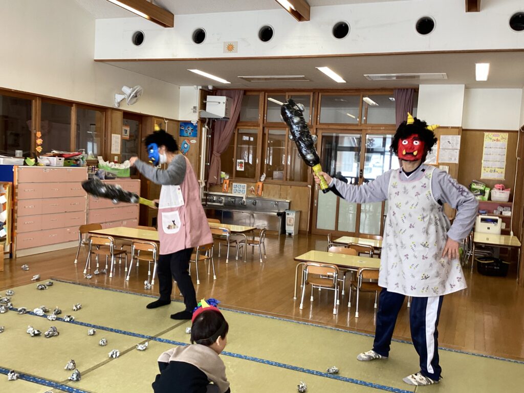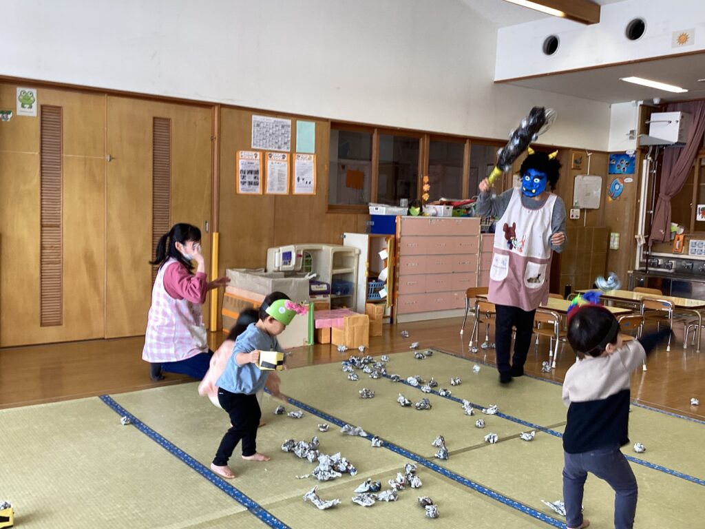 おにが怖くて逃げたり、泣いたりしながらも豆まきを頑張ったりす組さんでした。