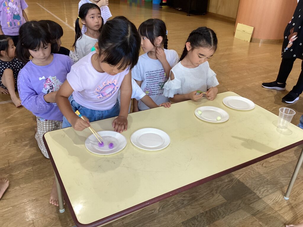 最後にきりん組の子どもたちは、箸の正しい使い方で箸つかみに挑戦!
